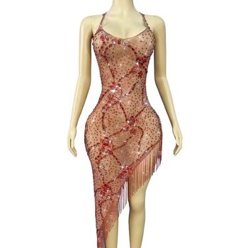 Gran oferta vestido de noche rojo Sexy de lujo para mujer cristal hasta la rodilla borlas diamantes de imitación tirantes finos para fiesta Club